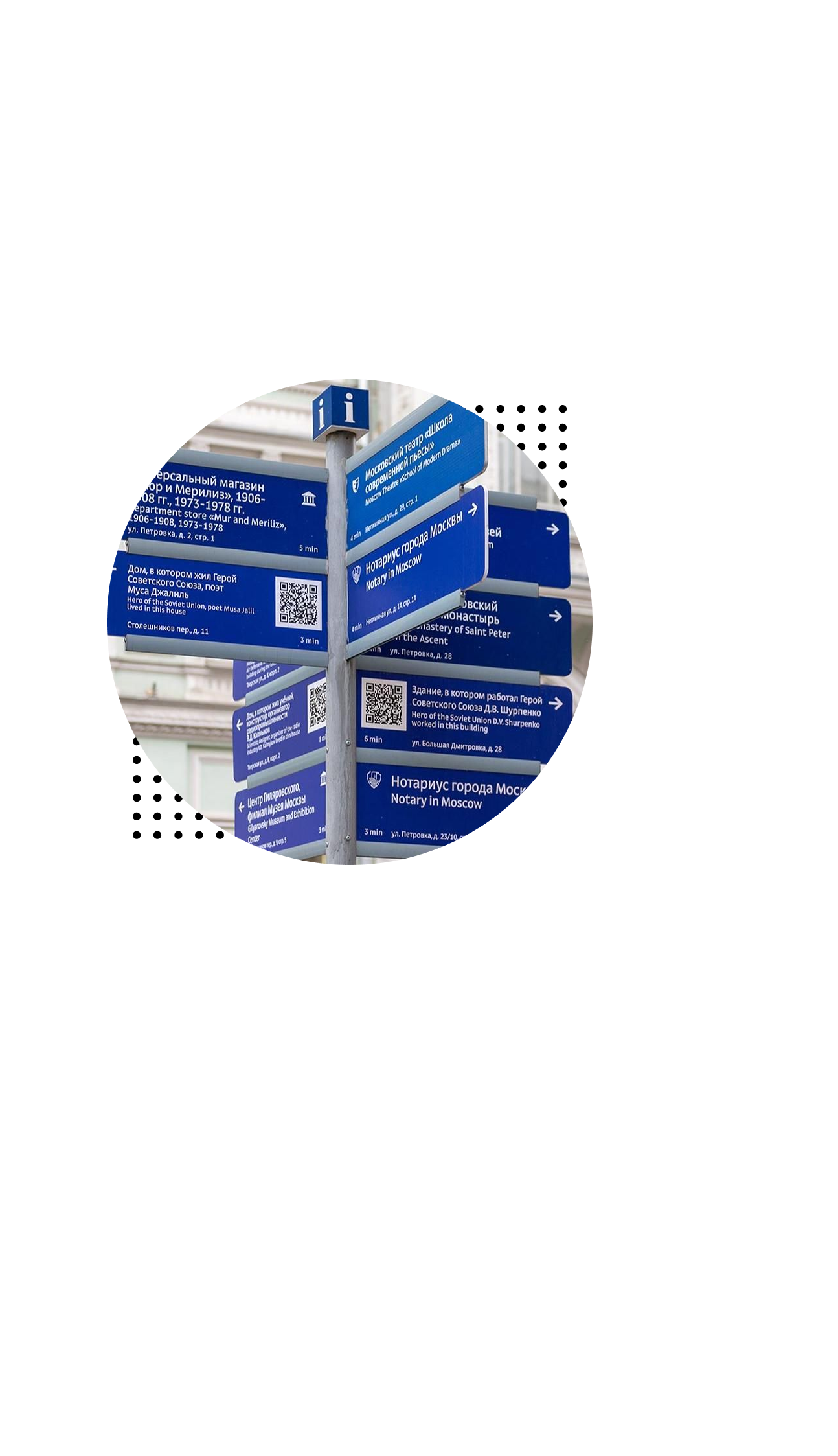 Информация дублируется на английском языке, а для удобства добавлены QR-коды. С их помощью можно узнать историю здания или памятника. Первые такие коды появились в преддверии 75-летия Победы и вели к Музею Победы, мемориалам и домам героев войны. Позже проект расширили: теперь коды рассказывают и о полярниках, писателях, космонавтах, учёных и храмах Москвы.